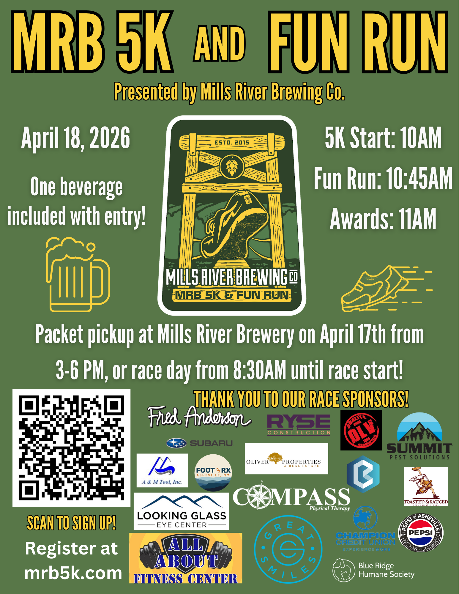 | 4/18/2026 | Mills River Brewing | 5k | Mills River | Riannon McNeil | 828/483-0480 |